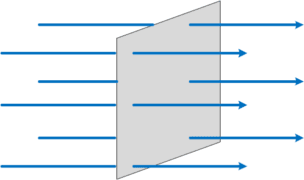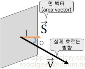 면벡터는 측정을 하려는 기준이 된다. 그런데 실제 흐르는 양을 재는 것이 아니라 측정하려는 방향으로 흐르는 양을 재는 것이다. 따라서 실제 흐르는 방향과 면벡터의 방향이 다르다면 재는 양 또한 달라질 수 밖에 없다.