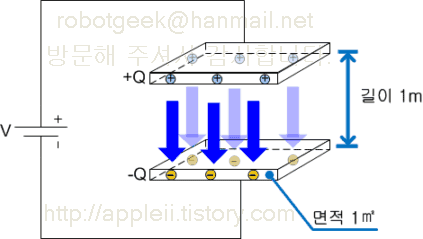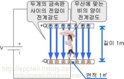 전기장에서 전기를 느끼려면 다음과 같이 측정할 수 있는 수단이 필요하다. 두 개의 금속판 사이의 거리가 1m 이고, 금속판의 면적은 1m2 이다. 전기장은 두 개의 금속판 사이에서는 어느 위치에서도 일정하다. 전기장이 형성된 공간 아무데서나 아래와 같은 측정을 하면 전기장을 만들어낸 존재를 알 수 있게 된다. 전속밀도의 단위는 C/m2 이다. 많은 사람들이 D = εE 를 오해한다. " E에 계수를 곱하면 D가 되는 것이 아닌가?" E 의 단위는 V/m 이고 D 의 단위는 C/m2 이므로 절대 그렇게 될 수 없다. 유전율 ε 의 단위는 F/m 이다. 상대유전율은 차원이 없는(Dimensionless) 상수라서 오해를 하는 것 같다. 상대유전율에 자유공간의 유전율을 곱한것이 유전율 ε이다.