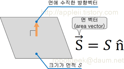 면벡터(area vector)는 상당히 독특한 벡터이다. 크기가 길이인 일반적인 벡터와는 달리 크기가 면적으로 표시된다. 이것은 기준을 면적으로 하기 위한 도구이다. 아래 그림에서 크기는 S이고 n에 모자를 씌운 모양은 면에 수직한 단위벡터이다. 면에는 방향이 2개가 있기 때문에 어느 방향인지 주의해서 봐야 한다.