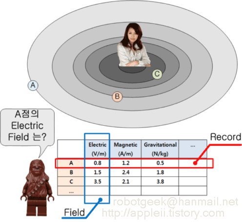 그런데 Field 는 다른 곳에서는 또 다른 뜻으로 쓰인다. 예를 들어 데이터베이스에서는 Field 를 영역이라는 뜻으로 쓴다. 이름, 전화번호, 주소를 데이터베이스로 만들었을 때 이름, 전화번호, 주소 각각이 Field 가 된다. 이것들은 서로 겹치지 않고 고유한 영역이다. 하나의 이름과 전화번호, 주소를 모으면 Record 가 된다. 오히려 이것이 전자기학에서 말하는 Field 의 뜻에 가깝다.