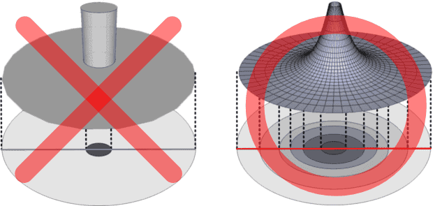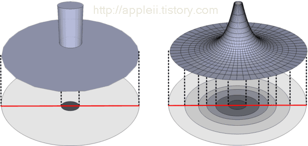 그림을 입체적으로 그려보자. 왼쪽은 중심에 기둥이 있고 나머지 공간은 높이가 0이다. 오른쪽은 중심에서 가장자리로 가면서 점점 높이가 낮아진다. 전하는 주변 공간을 변형시킨다. 거꾸로 말하면 주변공간이 변형된 것을 전하라고 부른다. 물질과 공간을 명확히 구별하지 않는 관점에서는 어떻게 표현해도 맞는 말이다. 가우스 법칙에서 전하밀도는 공간이 변형되어 있는 정도, 또는 공간의 기울기를 뜻한다. 따라서 실제의 모습은 오른쪽그림에 가깝다.