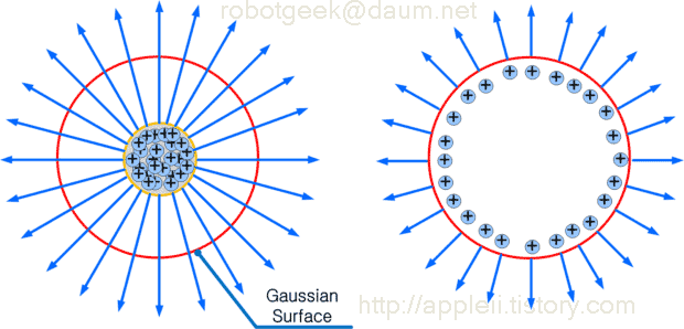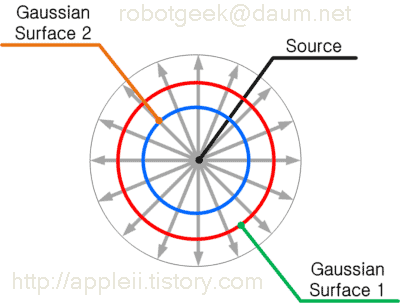 그것은 범위를 크게 잡았느냐 작게 잡았느냐의 차이다. Gaussian Surface 를 따라서 흐르는 물의 양을 측정하는 측정기를 각 지점마다 하나씩 설치해 보자. Gaussian Surface 를 크게 잡았다면 측정기 각각에 측정되는 물의 양은 작을 것이다. 하지만 측정기의 수가 많으므로 물의 양을 모두 더해 보면 Gaussian Surface 2 에서 측정한 양을 더한 것과 같을 것이다. 굳이 이렇게 설명하는건 전기력선을 이용하여 그림을 그리면 전하에서 선이 나오는 것이 아니냐는 오해를 하기 때문이다. 전하 분포가 시간에 따라 변하지 않는 정전계인데 선이 나올리가 없다. 가우스 표면을 어떻게 잡느냐에 따라서 전하들이 이동한다는 오해를 할수도 있다. 그러나 전하가 이동하면 전파가 발생한다. 정전계에서는 D(x,y,z)와 같이 표현된다. 시간에 따라 변하는 전계라면 D(x,y,z,t) 와 같이 시간 요소 t 가 추가된다. 정전계는 공간만 따지므로 전자기파가 나온다거나 하지는 않는다.