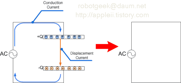 교류(AC) 를 커패시터에 흘려주면 물리적으로는 왼쪽과 같은 회로가 논리적으로는 오른쪽과 같은 회로가 된다. 즉, 실제로는 공간이 떨어져 있어서 전기가 통하지 않아야 하지만 논리적으로는 회로가 연결되어 있는 것처럼 생각하는 것이다. 이 때 커패시터에 흐르는 전류를 변위전류(Displacement Current)라고 한다. 전선에 흐르는 전류인 전도전류(Conduction Current)의 개념을 확장해서 공간적으로 떨어져 있어도 전류가 흐르는 것으로 생각하는 것이다.