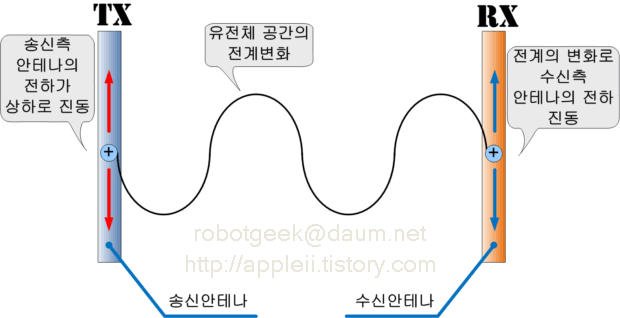 그림을 옆으로 그렸기 때문에 자계의 모습은 생략되어 있다. 무선통신은 물리적으로는 떨어져 있지만 전기적 관점에서는 서로 연결되어 있다.