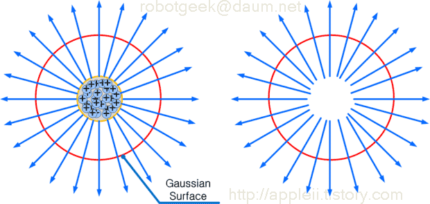 중간에 있는 전하 그림을 없애 보았다. 그래도 달라지는 것은 없다. 중요한 것은 전기적 속성의 밀도와 방향이지 무엇이 있느냐가 아니다. Gaussian Surface 에서 측정하는 것은 전기적 속성의 밀도와 방향이다. 그리고 그것의 합은 Gasussian Surface 를 크게 잡든 작게 잡든 동일하다. C/m2 라는 단위는 그 공간의 전기적 속성이 밀도로 표현된다는 것을 뜻한다. 여기에 단위벡터를 곱하면 방향까지 표시할 수 있다.