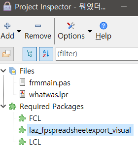 검색창에 fps 를 입력하면 관련 패키지 목록이 나타난다. 필요한 패키지는 laz_fpspreadsheetexport_visual 이다. 선택한다. Project Inspector 에 Required Packages 를 보면 laz_fpspreadsheetexport_visual 이 추가된 것을 알 수 있다.