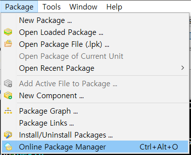 엑셀 파일 관리를 위해서 새로운 컴포넌트를 설치해야 한다. 설치할 컴포넌트는 FPSpreadSheet 컴포넌트이다. 컴포넌트 설치 방법은 온라인으로 하는 것이 제일 편하다. 메인메뉴에서 Package -> Online Package Manager 를 선택한다.